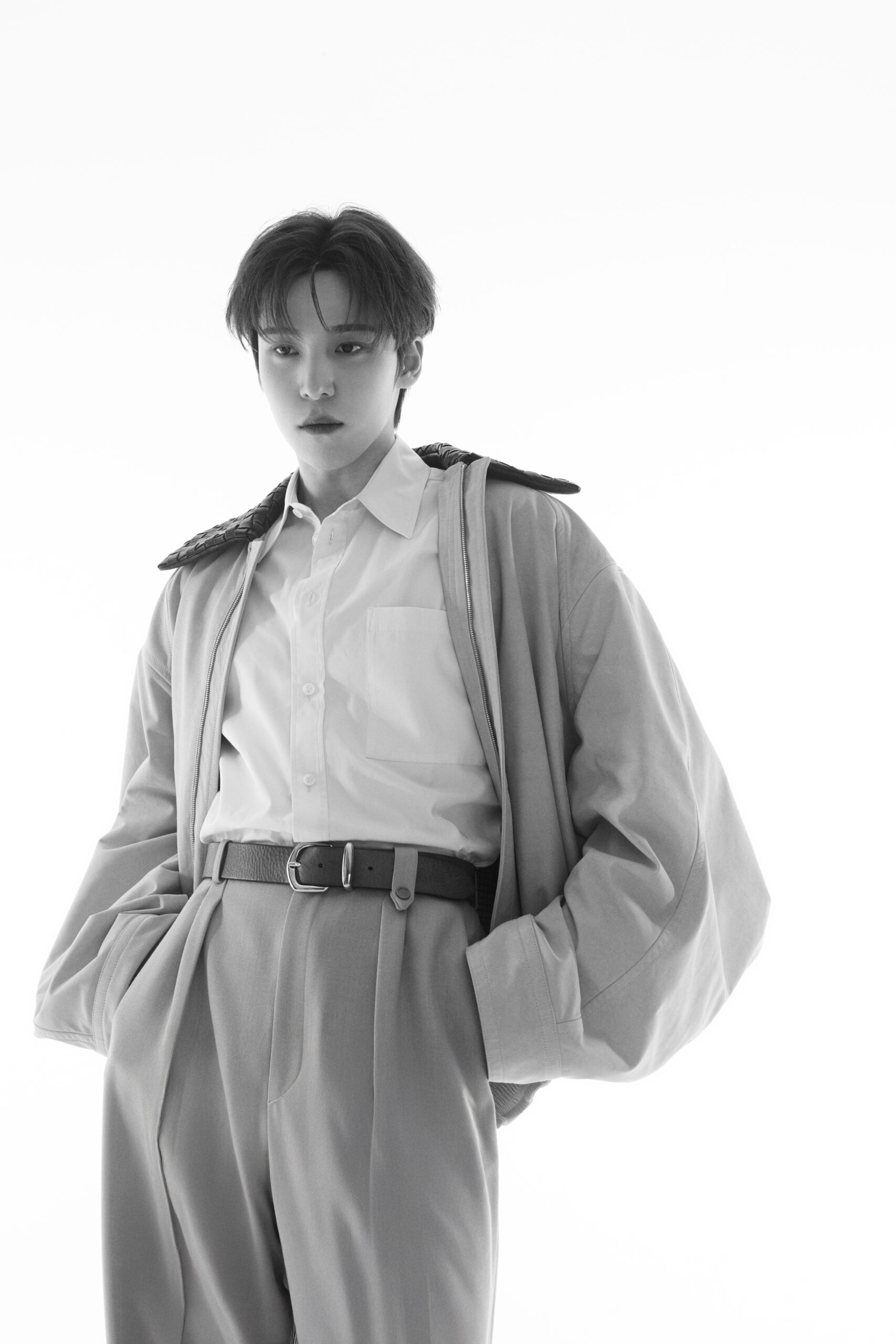Veste, chemise, chaussures BOTTEGA VENETA – Pantalon EGONLAB – Ceinture ISABEL MARANT – Collier MESSIKA